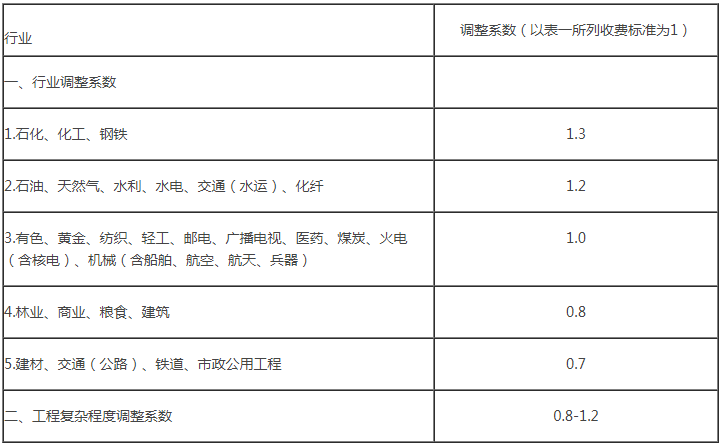 3.根據行業特點和各行業內部不同類別工程的復雜程度,計算咨詢費用時可分別乘以行業調整系數和工程復雜程度調整系數(見附件二)。