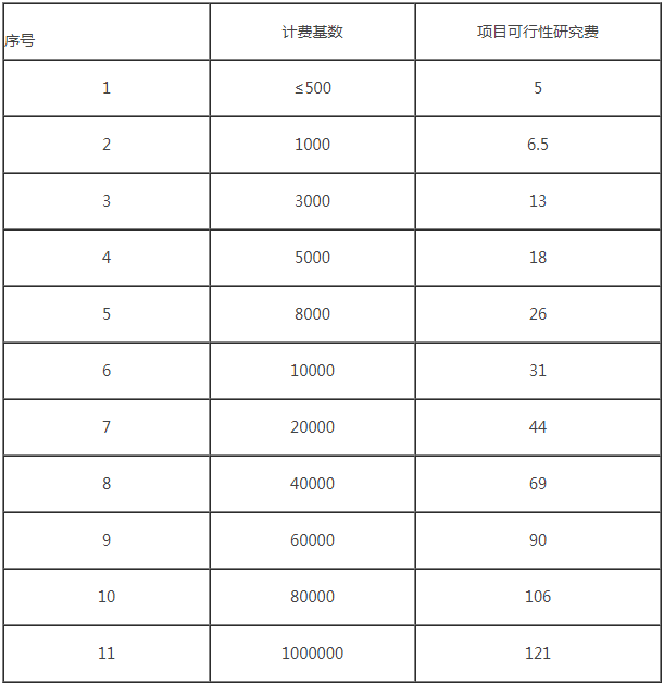 1、項目可行性研究費以工程施工費與設備購置費之和作為計費基數,釆用分檔定額計費方式計算,各區間按內插法確定。項目可行性研究費計費標準