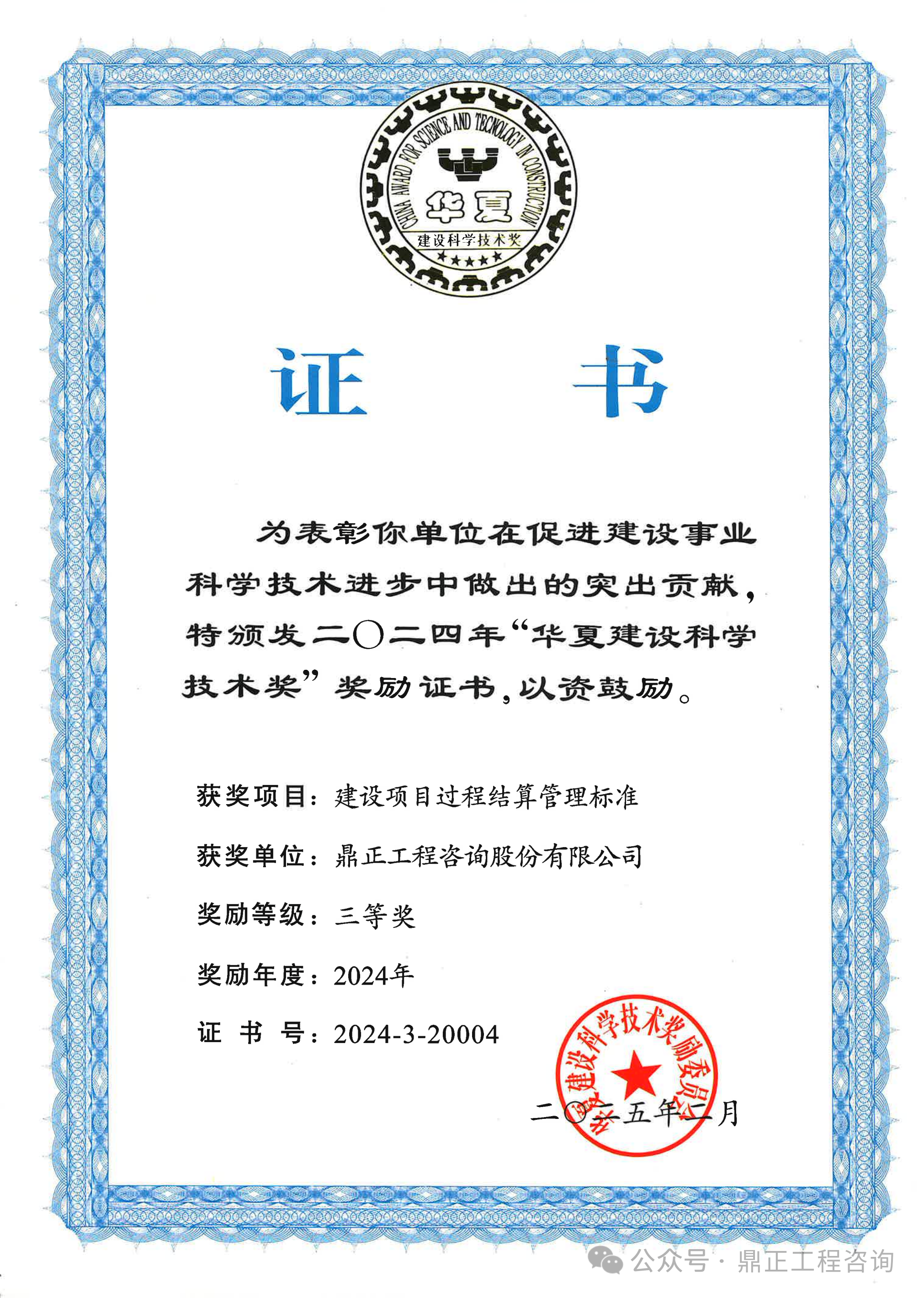 鼎正參與編制的《建設(shè)項目過程結(jié)算管理標準》(T/CECS 1178-2022)通過專業(yè)組和評審委員會的兩級評審,從700余個報送項目中脫穎而出,榮獲2024年度華夏建設(shè)科學技術(shù)獎三等獎。