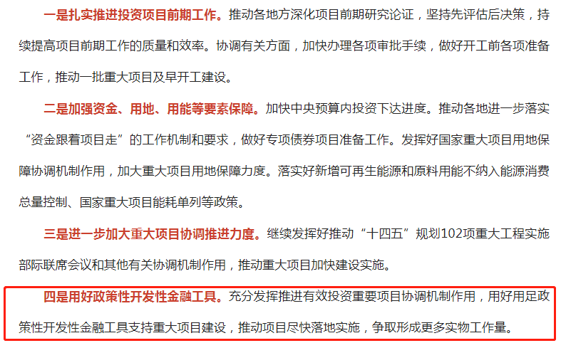資本金貸款的使用方式:一是補充投資重大項目資本金,不超過全部資本金的50%;二是對于短期內專項債券作為資本金無法到位的,可以為專項債券搭橋,通過金融工具的支持,能夠快速精準打通資本金無法到位造成的堵點,推動項目盡早開工,盡快形成實物工作量,助力穩定宏觀經濟大盤。