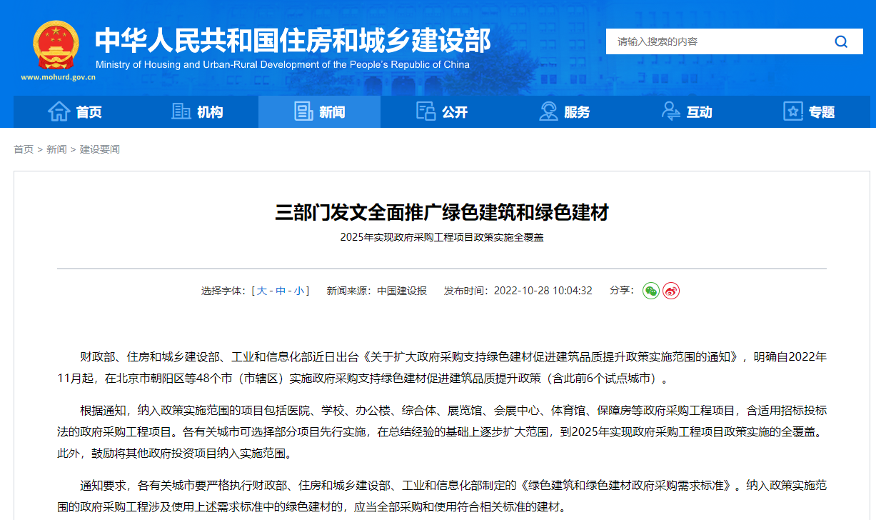 財政部、住房和城鄉(xiāng)建設(shè)部、工業(yè)和信息化部近日出臺《關(guān)于擴(kuò)大政府采購支持綠色建材促進(jìn)建筑品質(zhì)提升政策實(shí)施范圍的通知》,明確自2022年11月起,在北京市朝陽區(qū)等48個市(市轄區(qū))實(shí)施政府采購支持綠色建材促進(jìn)建筑品質(zhì)提升政策(含此前6個試點(diǎn)城市)。根據(jù)通知,納入政策實(shí)施范圍的項目包括醫(yī)院、學(xué)校、辦公樓、綜合體、展覽館、會展中心、體育館、保障房等政府采購工程項目,含適用招標(biāo)投標(biāo)法的政府采購工程項目。各有關(guān)城市可選擇部分項目先行實(shí)施,在總結(jié)經(jīng)驗的基礎(chǔ)上逐步擴(kuò)大范圍,到2025年實(shí)現(xiàn)政府采購工程項目政策實(shí)施的全覆蓋。