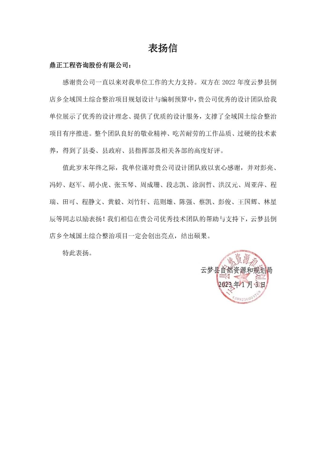 在2022年度云夢縣倒店鄉全域國土綜合整治項目規劃設計與編制預算過程中,項目團隊向業主展示了優秀的設計理念,提供了優質的設計服務,有條不紊地推進項目進行,高質量地完成了項目相關報規報批節點,獲得縣委、縣政府、縣指揮部及相關各部高度好評。本項目規格高、要求嚴格,在接到任務后,立即成立了項目組,多次深入現場調研,全力推動項目設計咨詢工作的開展,從項目建設必要性、建設規模、策劃及建設方案、工程實施計劃、投資估算及資金籌集、綜合效益等方面進行了詳盡地分析研究,為項目前期工作的開展發揮了咨詢智囊作用。在業主的大力支持下,項目組從立項到實施,克服了諸多困難,展現了優秀的設計咨詢能力和資源整合能力,其敬業態度和專業素養給業主留下深刻印象,并獲得業主單位給予一致好評。