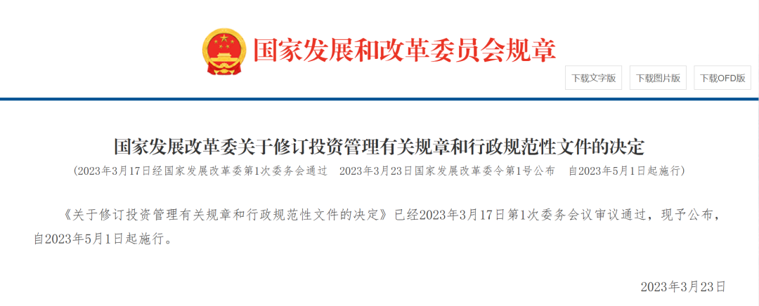 《關(guān)于修訂投資管理有關(guān)規(guī)章和行政規(guī)范性文件的決定》已經(jīng)2023年3月17日第1次委務(wù)會(huì)議審議通過,現(xiàn)予公布,自2023年5月1日起施行。