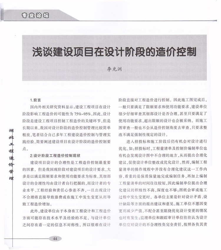 我司李光洲同志論文《淺談建設(shè)項(xiàng)目在設(shè)計(jì)階段的造價(jià)控制》發(fā)表