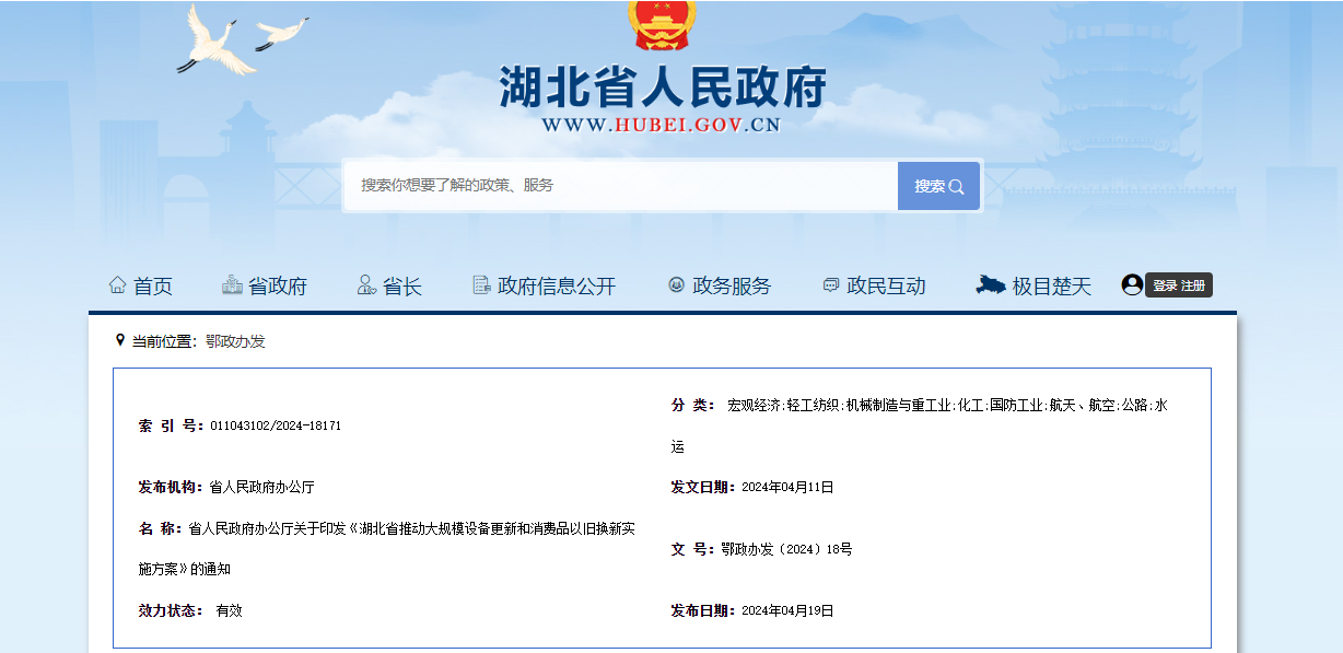 4月19日,湖北省人民政府網發布省人民政府辦公廳關于印發《湖北省推動大規模設備更新和消費品以舊換新實施方案》的通知。