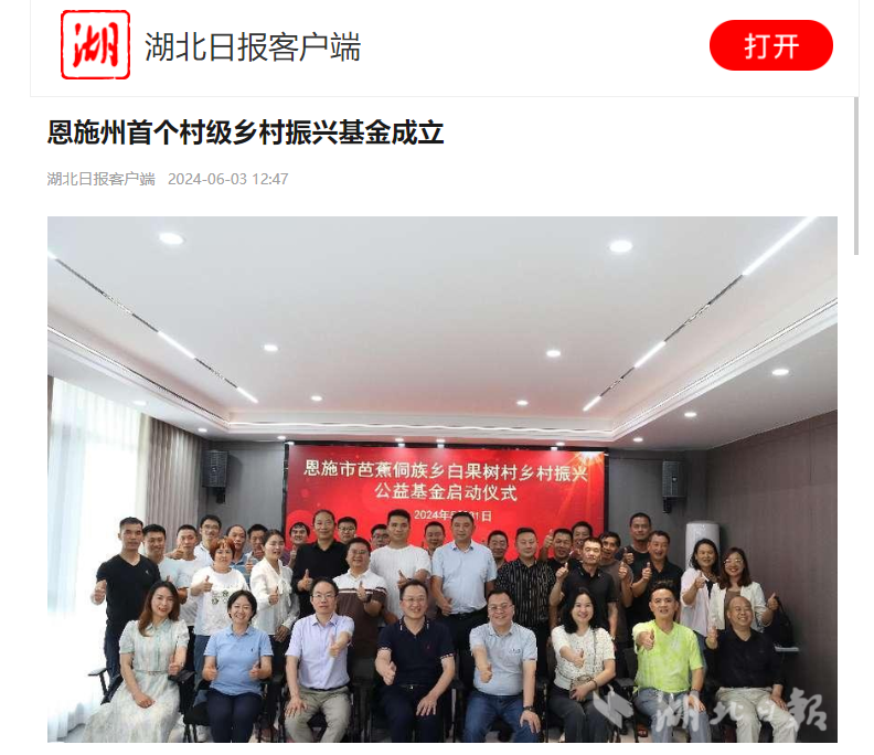 5月31日下午,恩施市芭蕉侗族鄉白果樹村鄉村振興公益基金在白果樹村正式啟動,這是恩施州首個村級鄉村振興基金,也是白果樹村加快推進鄉村振興的最新創舉。
