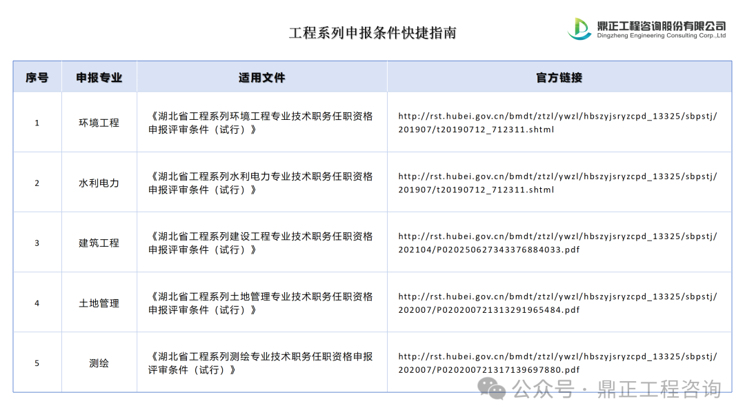 鄂職改辦已下發(fā)《湖北省職稱評(píng)審專業(yè)目錄》(鄂職改辦〔2021〕46號(hào)),其中工程系列已涵蓋環(huán)保、水利水電、建筑、土地、測(cè)繪、規(guī)劃等相關(guān)專業(yè),詳見(jiàn)下圖:
