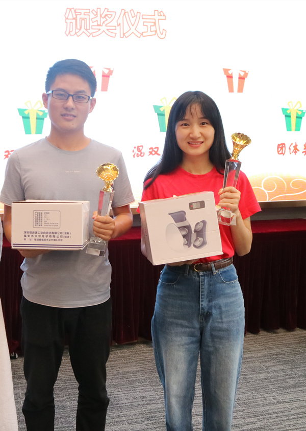 副總經理毛迎霞為混雙三等獎獲得者王雁然、張愉頒獎